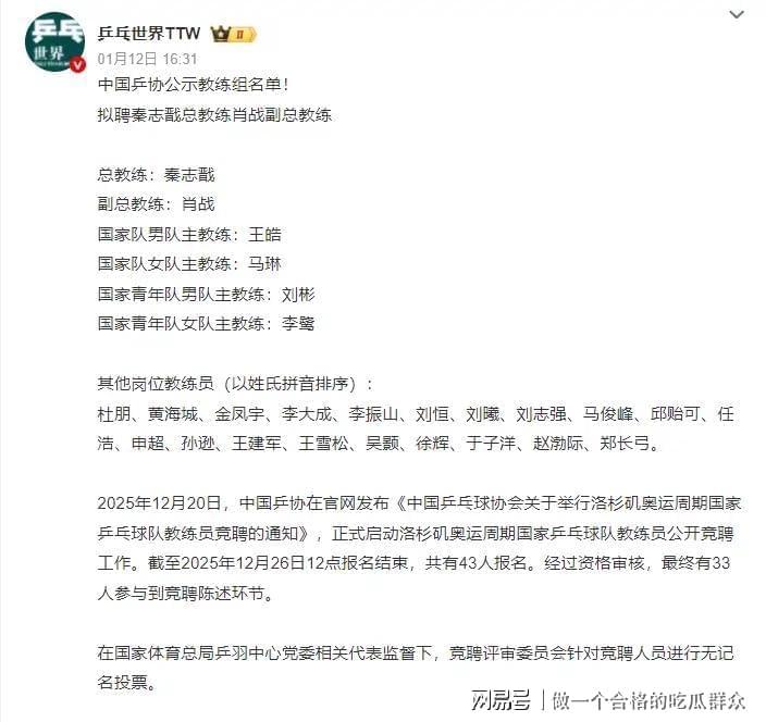 千呼万唤始出来!2026年1月12日,中国乒协正式公示洛杉矶奥运周期教练员竞聘结果,一场牵动无数球迷心弦的"高层大洗牌"尘埃落定。"